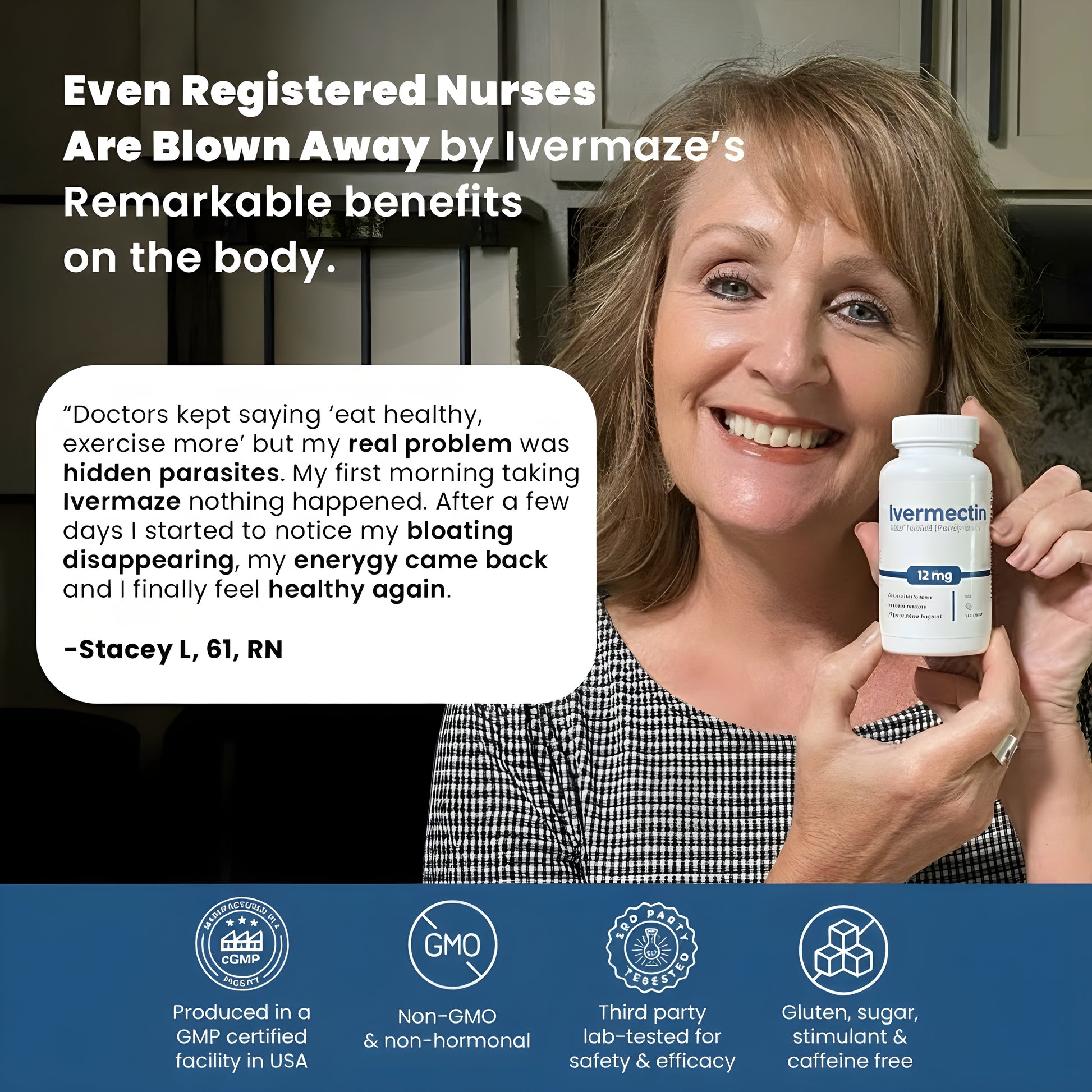 "After struggling with low energy and digestive issuers for a long time, Ivermaze has been a game changer. In just a few weeks, my energy improved and my stomach feels so much better- no more bloating. It's refreshing to find something that really works!"